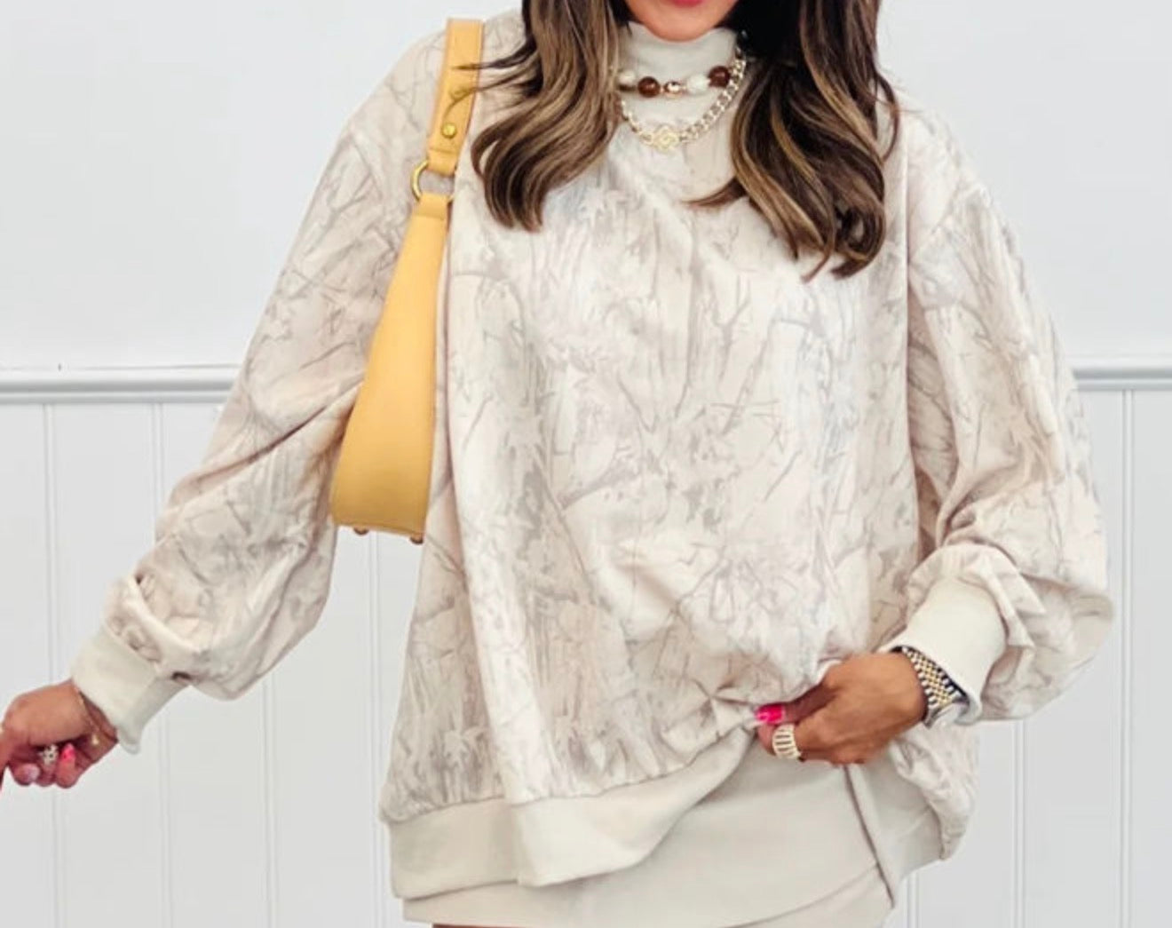 Meet your new cozy-girl essential. This neutral Camo oversized sweatshirt features a soft, subtle tonal print that gives effortless luxe vibes without trying too hard. Designed with balloon sleeves, an easy relaxed fit, and a super-soft interior, it’s perfect for leggings, denim, or layering over a turtleneck (just like the styled look!). Neutral enough for everyday wear but chic enough to dress up with accessories—this one is a must-have for fall and winter.