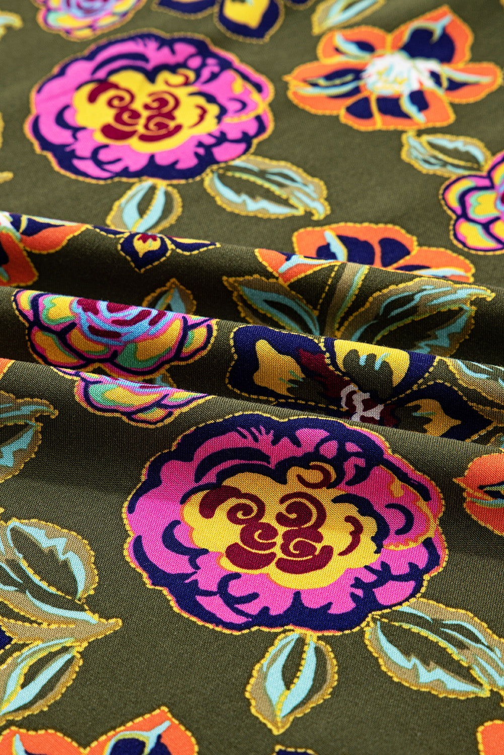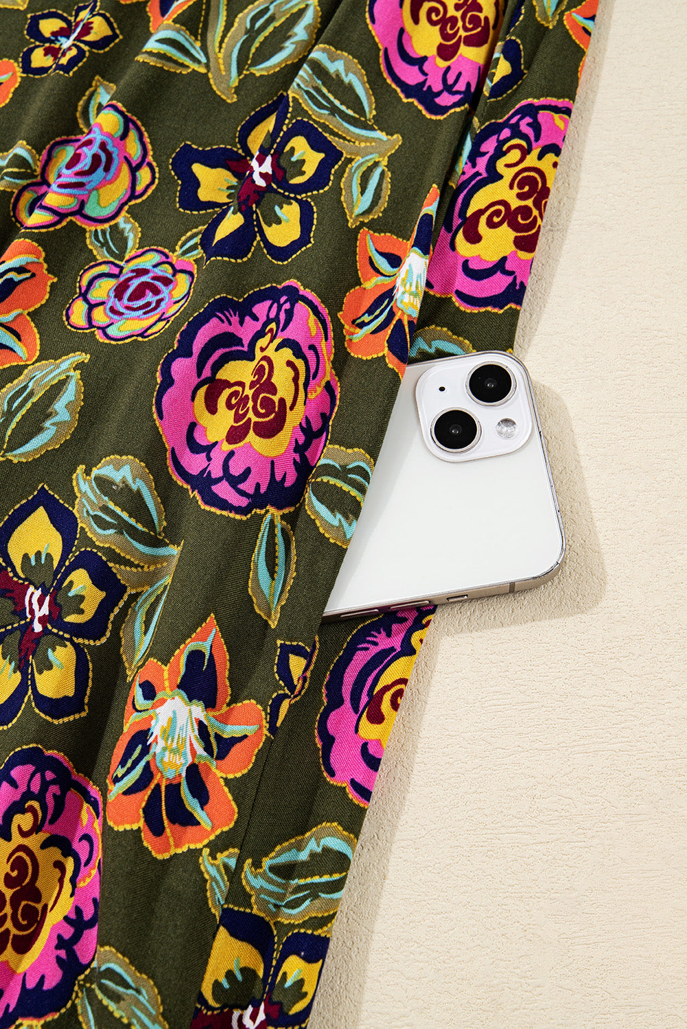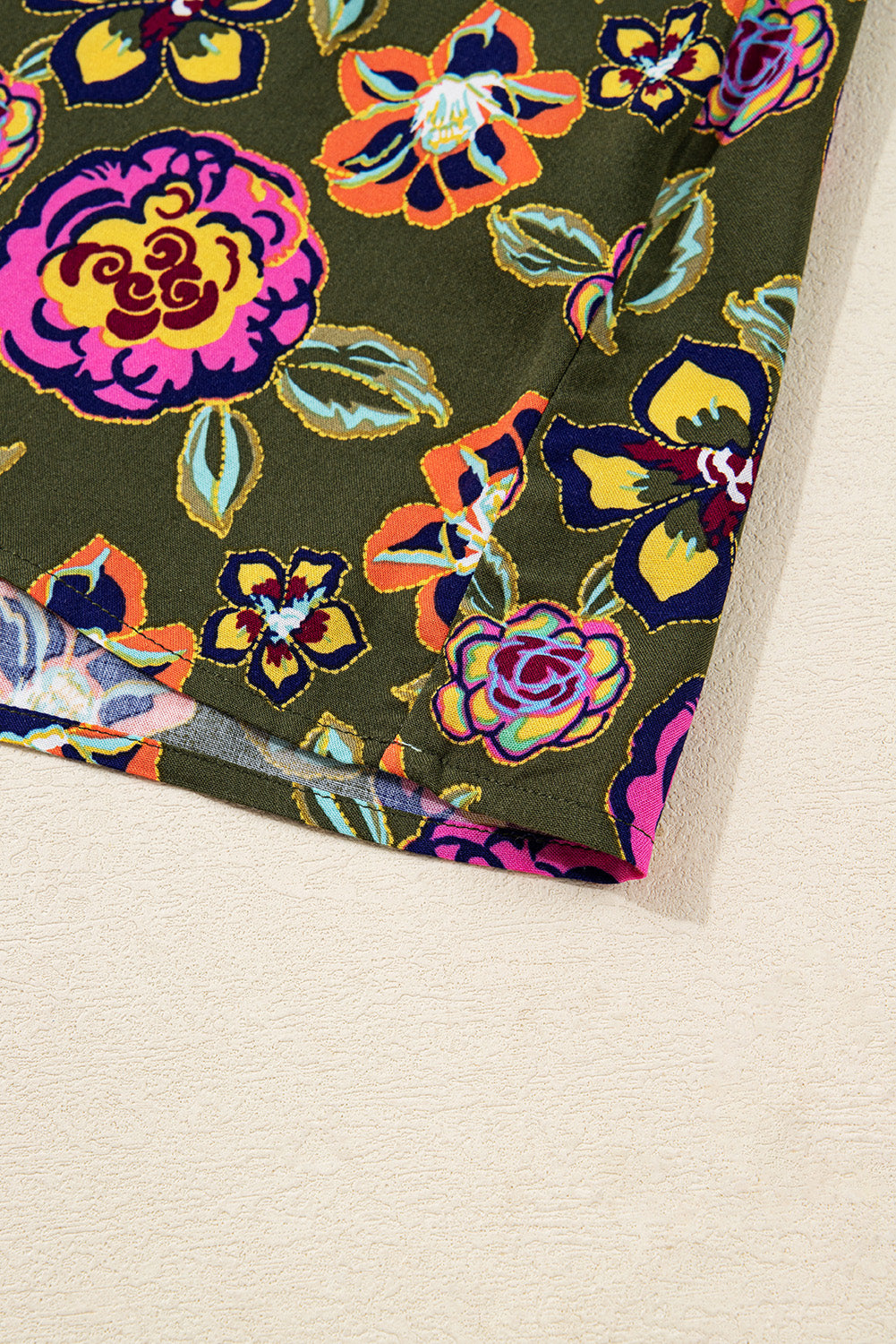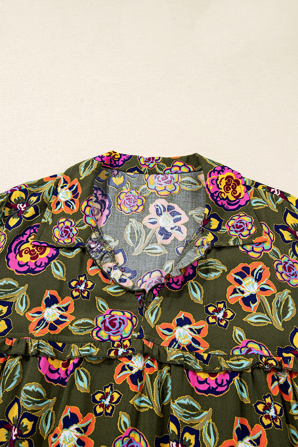 Green Floral Print Split Neck Bubble Sleeve Mini Dress